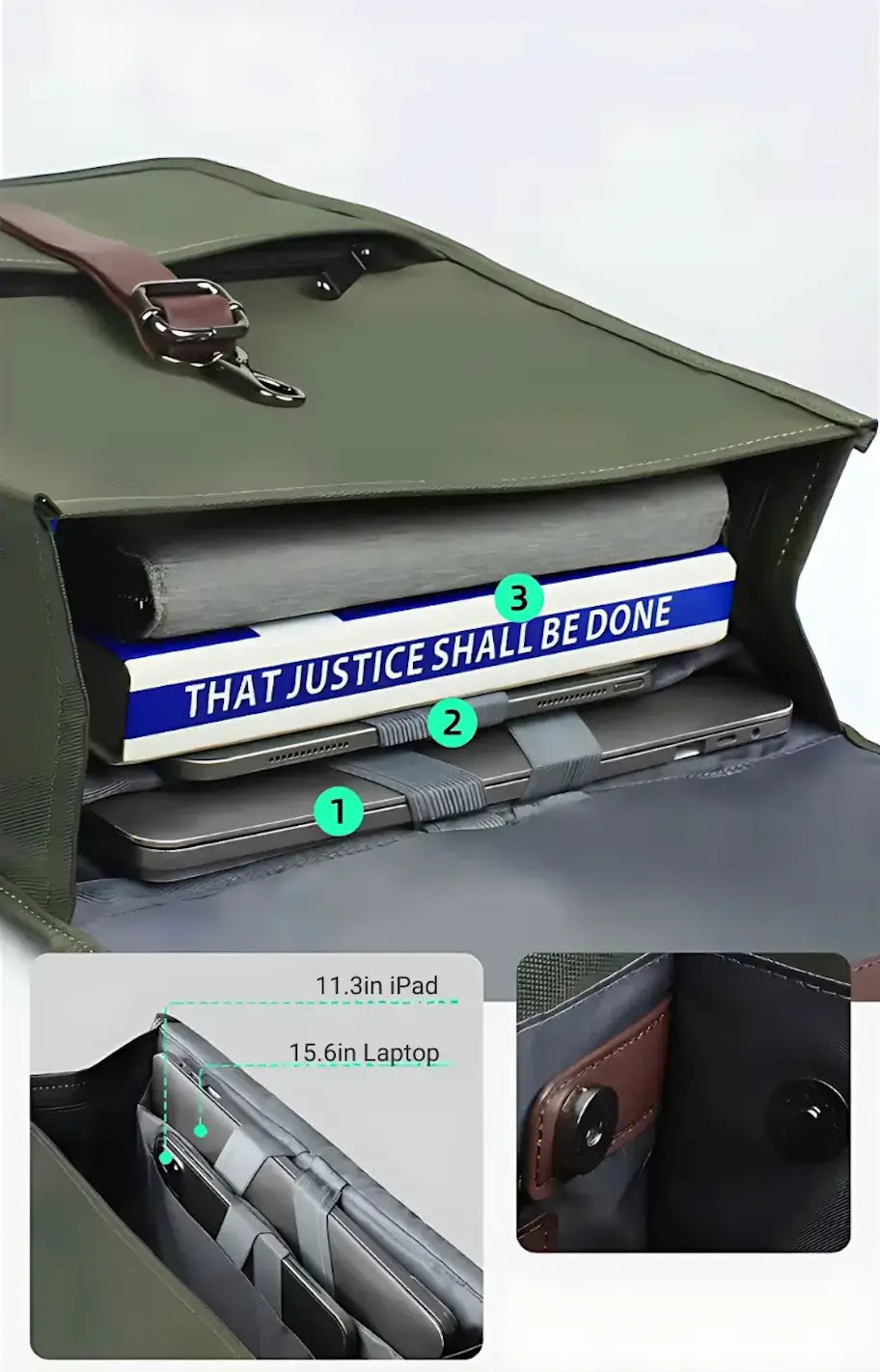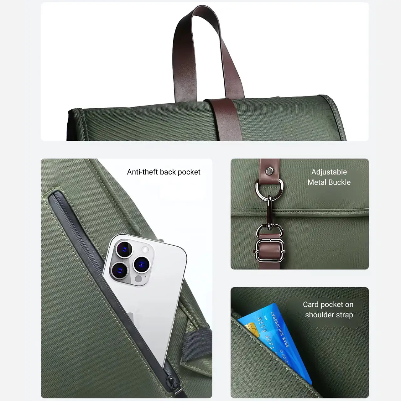 Entwickelt für Arbeit und Reisen, misst er 42 cm x 28 cm x 12 cm (16,5 in x 11 in x 4,7 in) und bietet ein leichtes Tragegefühl, während er die Essentials organisiert aufbewahrt. Das schlanke Profil macht ihn ideal für Berufspendler und Fachleute, die nach einer stilvollen und effizienten Trageoption suchen.